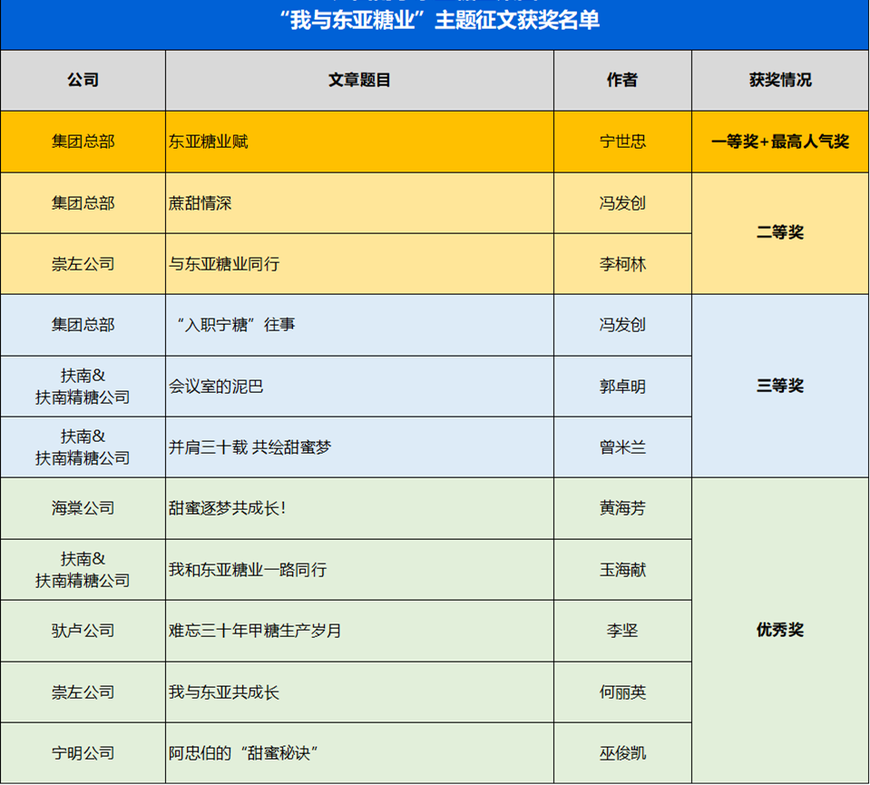 為展示東亞糖業(yè)30年來(lái)在廣西深耕的發(fā)展歷程和成就、記錄企業(yè)的發(fā)展歷史、共同展望未來(lái)的發(fā)展前景,公司舉辦了“我與東亞糖業(yè)”主題征文評比活動(dòng)。經(jīng)過(guò)組織評委評選和員工在北森系統投票評選,依據立意、內容、結構、文采、創(chuàng )意、豐富、深刻等10個(gè)統一的評分標準和規則對作品進(jìn)行嚴格評比,最終結果揭曉,共評出一等獎1名(篇)、二等獎2(篇)、三等獎3名(篇)、優(yōu)秀獎5名(篇),最高人氣獎1名(篇),公司對獲獎作者將頒發(fā)榮譽(yù)證書(shū)、獎杯及獎金,以資鼓勵。
